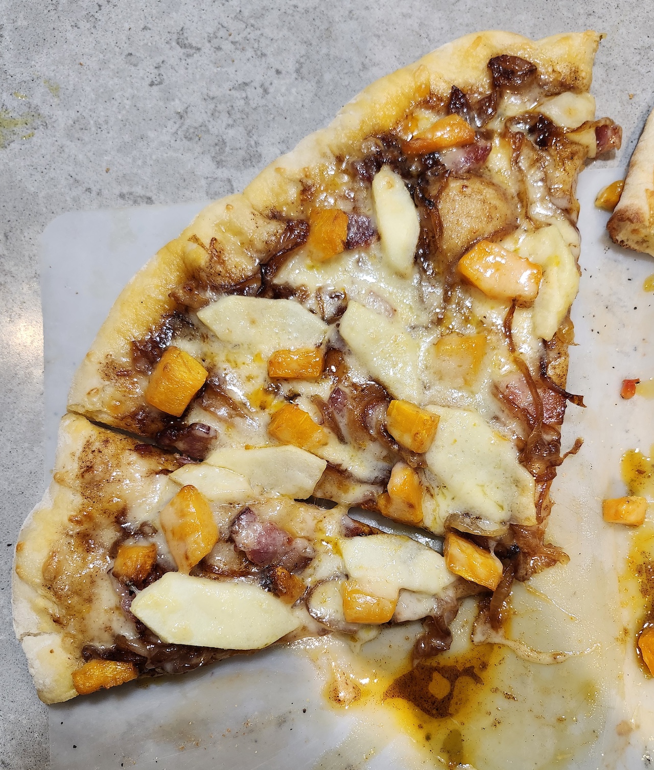 - Sweet 'n' Spicy (with modifications by Stacey) - Roasted Butternut Squash, Cider Caramelized Onions, Bacon, Apple, Smoked Gouda, and Cheddar Cheese on a Chili, Cinnamon, Honey Olive Oil Sauce