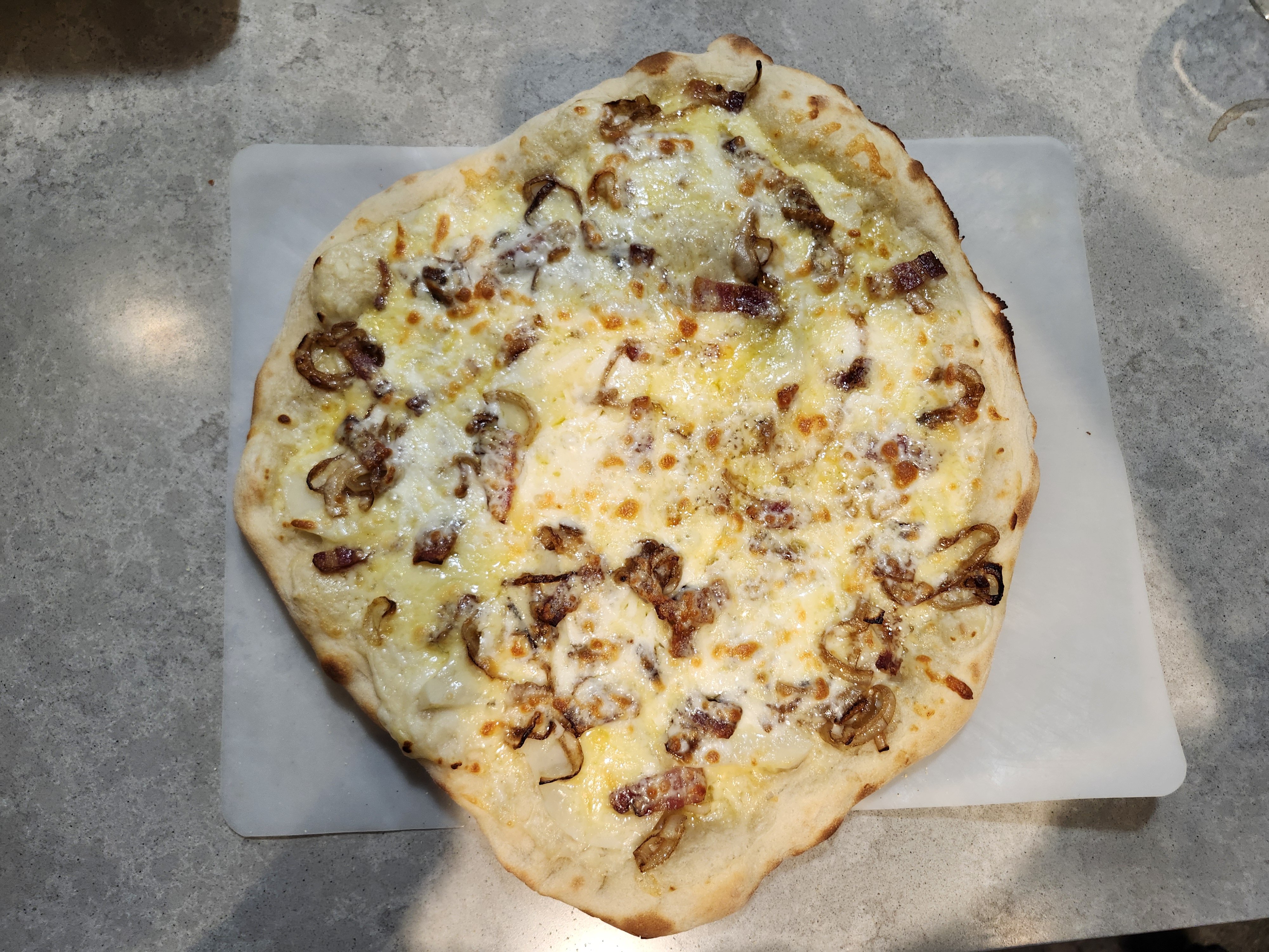 - Top o' the Mornin - White Sauce, Potato, Guiness Braised Onions, Bacon, Irish Cheddar, and Mozzerella