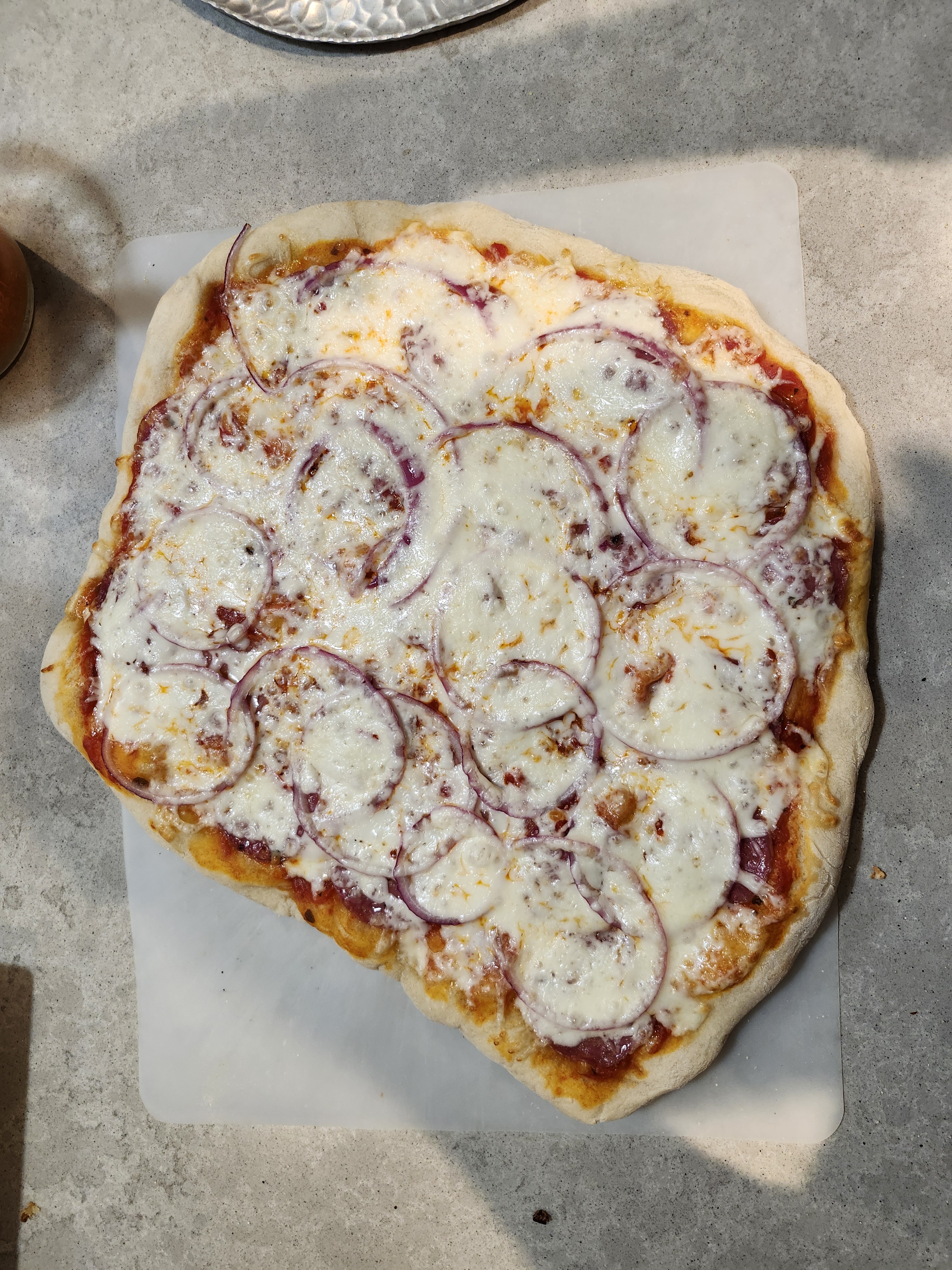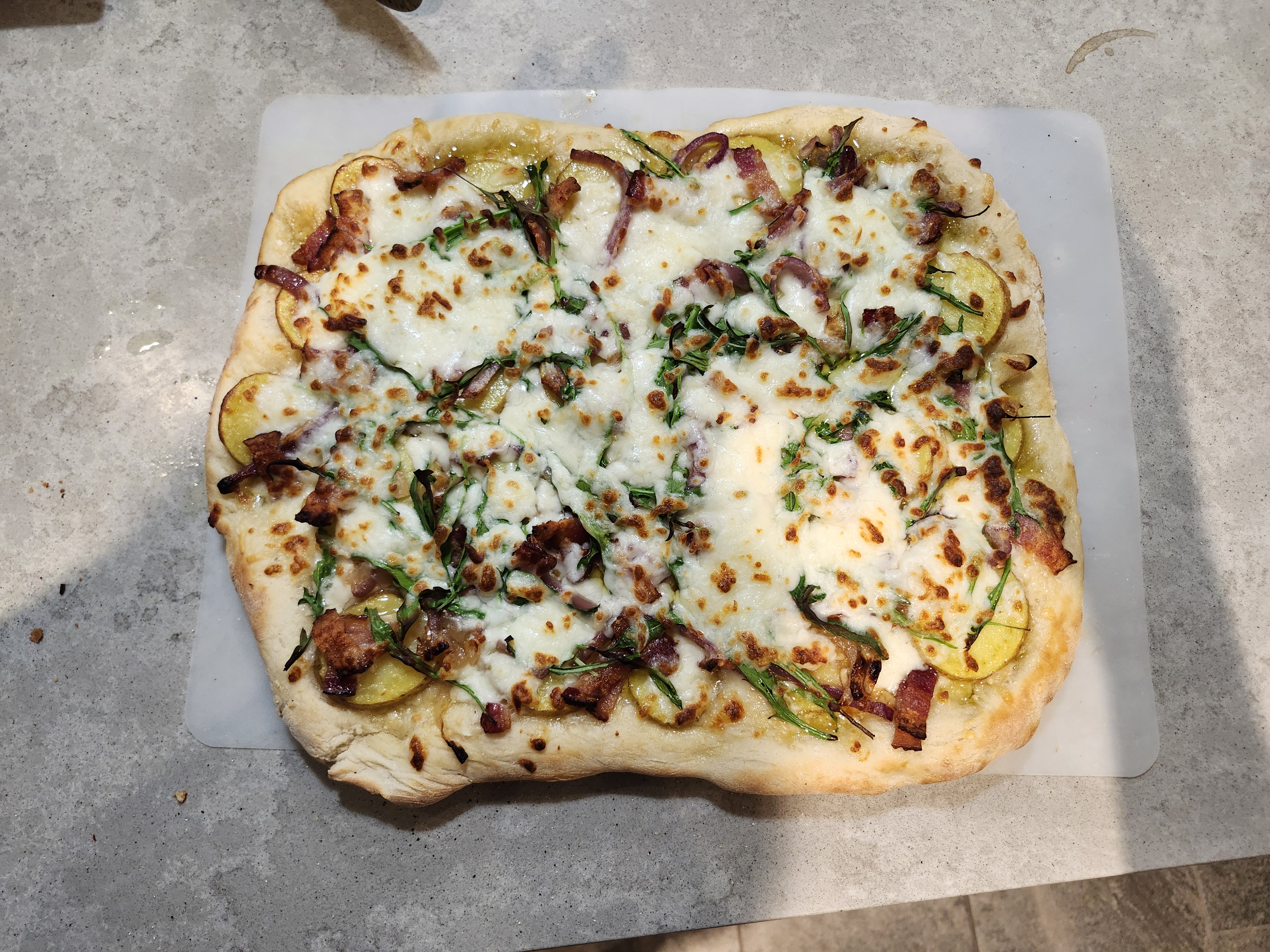 - Ed's (contributed by Ed & Lesie) - Olive Oil, Parmessan, Bacon, Potato, Onion/Garlic, Garden Fresh Arugula, and Mozzarella